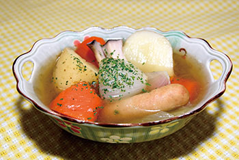 ❹❸にトマトジュースとビーフコンソメを入れ5~10分煮立てたら、水溶き片栗粉を加え混ぜる。塩・コショウで味をととのえ、パセリをふりかけたら完成。