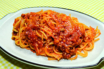 ⑧ お湯が沸騰したら塩、スパゲッティを入れ10分ほど茹でる。