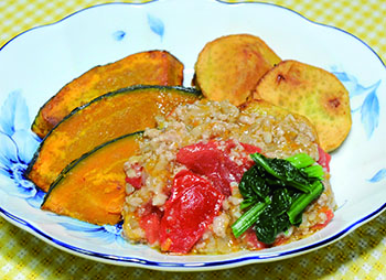 ⑦カボチャ、さつま芋を厚切りにしオリーブオイルで素焼きにする。